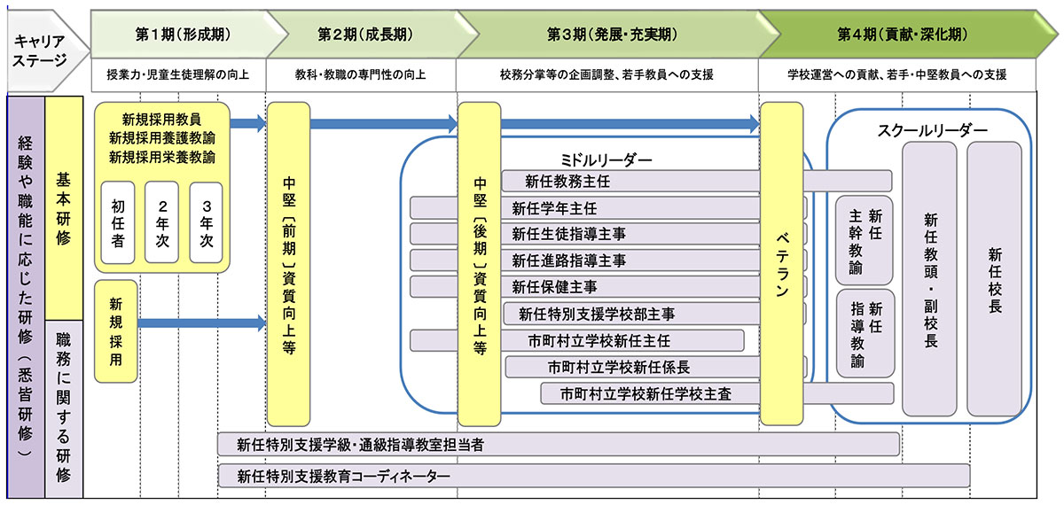 教員の大量退職、大量採用等の影響から年齢構成や経験年数の不均衡が生じ、従来の学校組織において経験豊富な教員から若手教員への知識や技術等の伝達に課題が生じていることや、学校を取り巻く環境及び社会全体が急速に変化していること等を踏まえ、国は、教員の養成・採用・研修を通じた新たな研修体制や学び続ける教員を支えるキャリアシステムの構築などを行うため、平成28年11月28日に教育公務員特例法等の一部を改正する法律を公布し、平成29年4月1日から施行されました。同法の規定により、各都道府県教育委員会には、文部科学大臣が定める指針を参酌し、地域の実情に応じ、校長及び教員(以下「教員等」という。)の職責、経験及び適性に応じて向上を図るべき教員等としての資質に関する指標(以下「指標」という。)及び教員研修計画を定めることが義務付けられました。