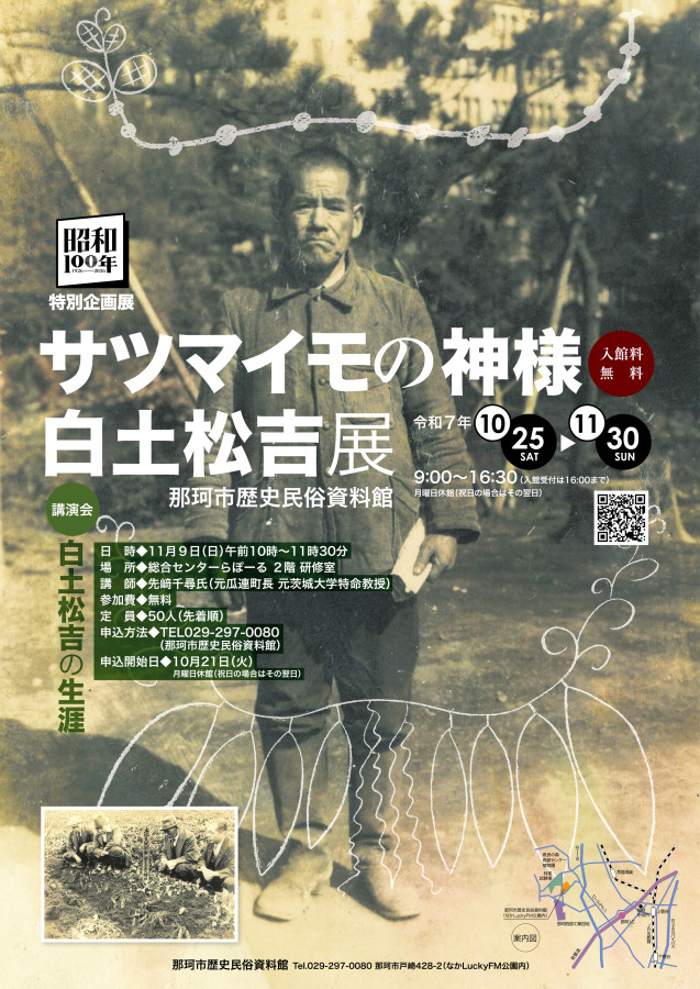 那珂市歴史民俗資料館では、農業の発展に貢献し令和6年度に名誉市民にも選ばれた「サツマイモの神様 白土松吉展」を開催します。