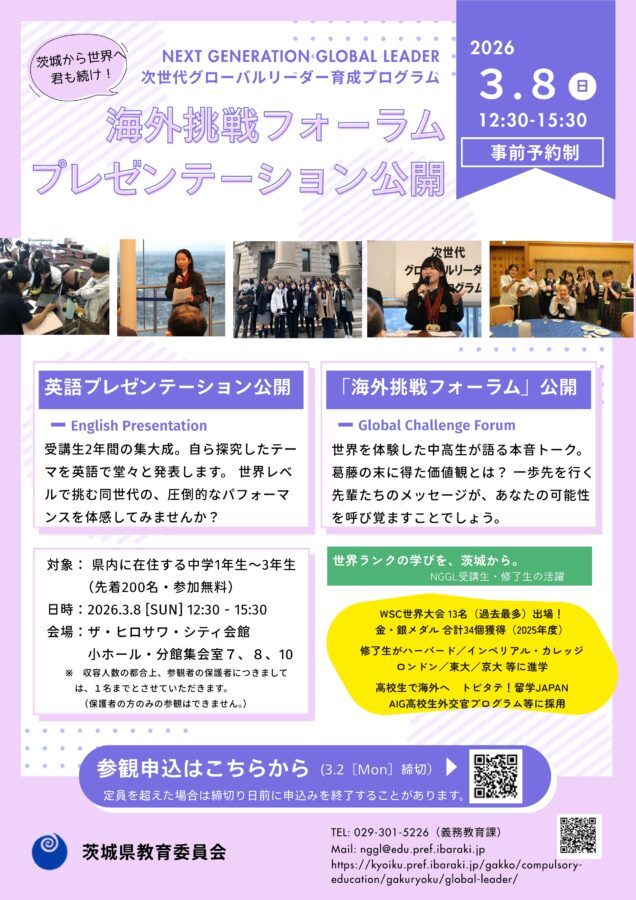 次世代グローバルリーダー育成プログラム受講生による、「海外挑戦フォーラム」と「英語プレゼンテーション」を、県内在住の中学1年生〜3年生を対象(先着200名)に公開します。ぜひ、お申し込みください!