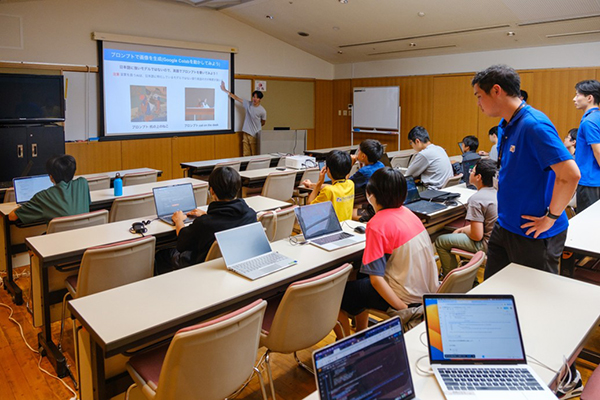 同日に行われた「AIプログラミングコース」では、前回の講習会で制作したAIチャットボットを発展させた作品発表が行われました。発表後には、生成AI「Stable Diffusion」を用いた画像生成アプリ開発のワークショップが実施され、参加者たちはプログラミングを駆使してAI技術の可能性を探究しました。参加者からは「画像認識の仕組みをもっと深く学びたくなった」などの感想が寄せられ、AIへの関心の高まりがうかがえました。