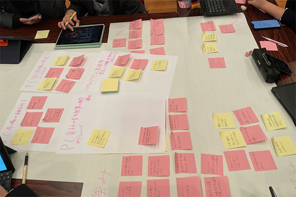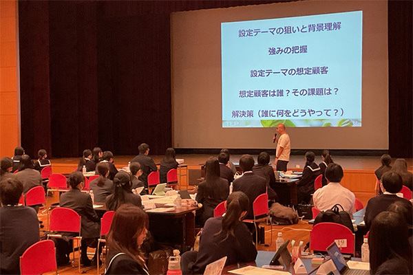 最初に、筑波大学の尾﨑典明先生から目的設定と課題解決の手法について講義があり、続いて各グループが方向性とルールづくり、役割分担を整え、チームの土台を形成しました。生徒は学校・学科の枠を越えた混成チームで、現場像と顧客像を描き込みながら論点を整理しました。