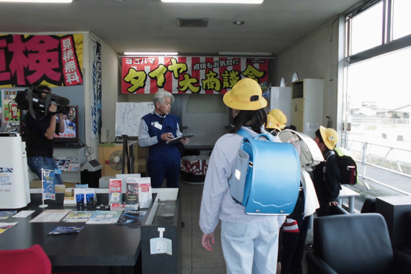 その後、実際に通学路近辺にあるガソリンスタンドに避難する訓練を実施しました。ガソリンスタンドの手前で不審者役から声を掛けられた児童がガソリンスタンドに駆け込んでくると、店員が児童をガソリンスタンドの安全な場所に誘導し、その後、声を掛けられた時の様子や、不審者の特徴について児童から話を聞きました。児童は、不審者役の特徴及び付近に停車していた不審な自動車の情報を正確に伝えることができていました。