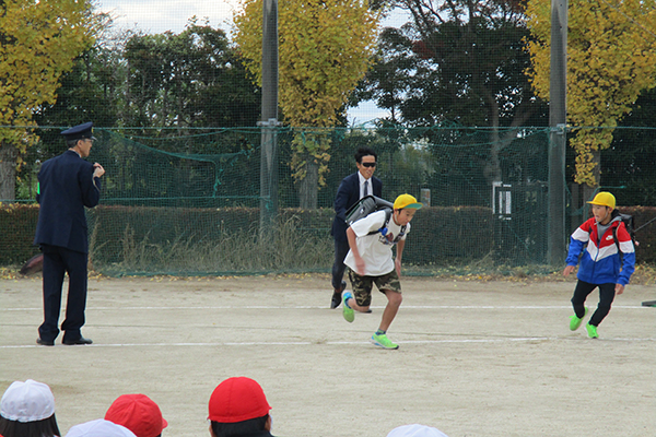 次に、茨城県警察本部生活安全総務課による、避難訓練が実施されました。不審者役の警察官から走って逃げる「20mダッシュ訓練」を行いました。児童は、6m離れた場所から追いかけてくる不審者役から、20mの距離を走って逃げ切りました。