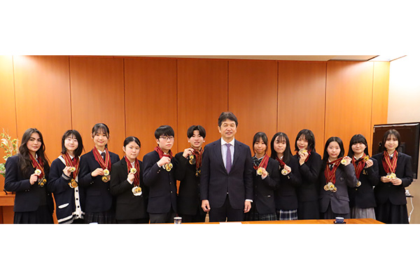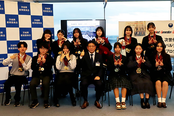 茨城県教育委員会が実施する「次世代グローバルリーダー育成プログラム(NGGL)」の受講生が、アメリカのイェール大学で開催された「ワールド・スカラーズ・カップ(WSC)世界決勝大会」での結果を報告するため、大井川知事を表敬訪問しました。今回の大会では、NGGL受講生13名が計34個(金17・銀17)のメダルを獲得し、事業開始以来の最多記録を更新しました。