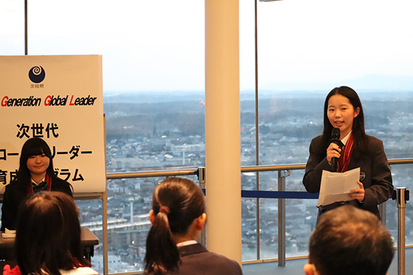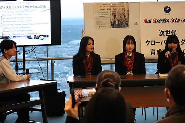 知事への報告後、受講生たちは県庁25階の展望ロビーへ移動し、大会報告や「世界からみた茨城」をテーマに英語によるディスカッションを披露しました。