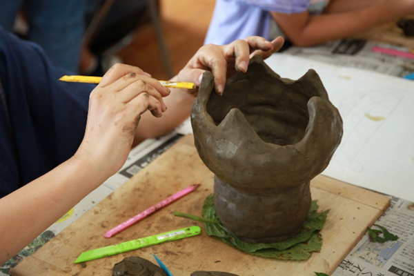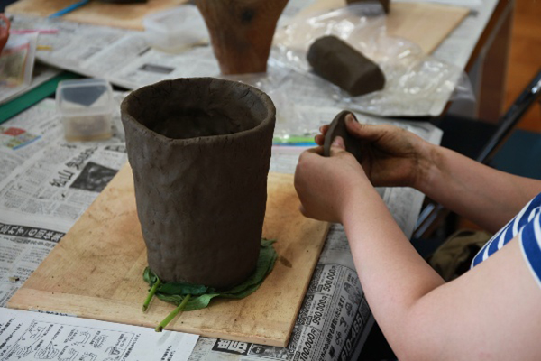 各自が作成した縄文土器のイメージ図をもとに縄文時代の人々と同じやり方(輪積み)で土器を作り上げました。形が出来上がったら、仕上げに、前回作成した「縄文原体」などを使って、模様をつけました。参加者全員が思い思いの作品を精魂込めて仕上げていました。
